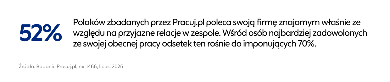 - 52% badanych przez Pracuj.pl poleca swoją firmę znajomym, którzy chcą pracować z fajnymi ludźmi