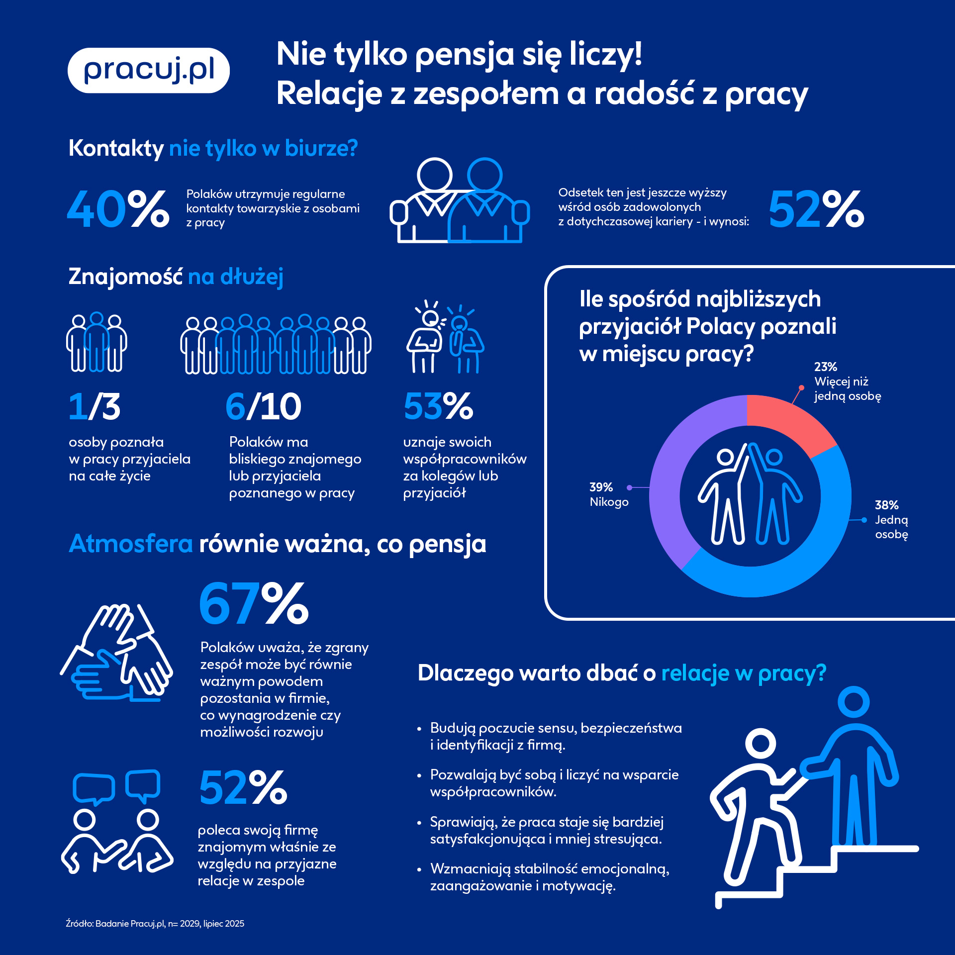 Nie tylko projekty i zadania składają się na codzienność w pracy – równie ważne okazują się więzi, które z czasem przeradzają się w coś więcej niż koleżeństwo. Jak pokazuje najnowsze badanie Pracuj.pl, aż 40% Polaków utrzymuje regularne kontakty towarzyskie ze współpracownikami, a 1 na 3 osoby poznała w pracy przyjaciela na całe życie – i to właśnie ci pracownicy częściej deklarują, że są bardzo zadowoleni ze swojej kariery. Znajomości zawarte w pracy potrafią więc nie tylko umilić dzień, lecz także mogą realnie wpływać na nasze poczucie sensu w pracy i poza nią.