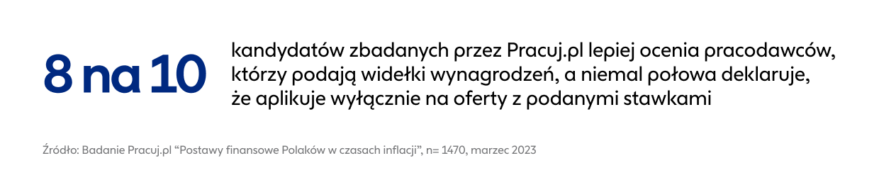 - Aż 8 na 10 kandydatów lepiej ocenia pracodawców, którzy podają widełki wynagrodzeń, a niemal połowa deklaruje, że aplikuje wyłącznie na oferty z podanymi stawkami.