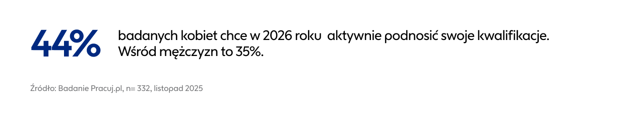 - Aż 44% kobiet chce w 2026 roku aktywnie podnosić swoje kwalifikacje. Wśród mężczyzn to 35%.